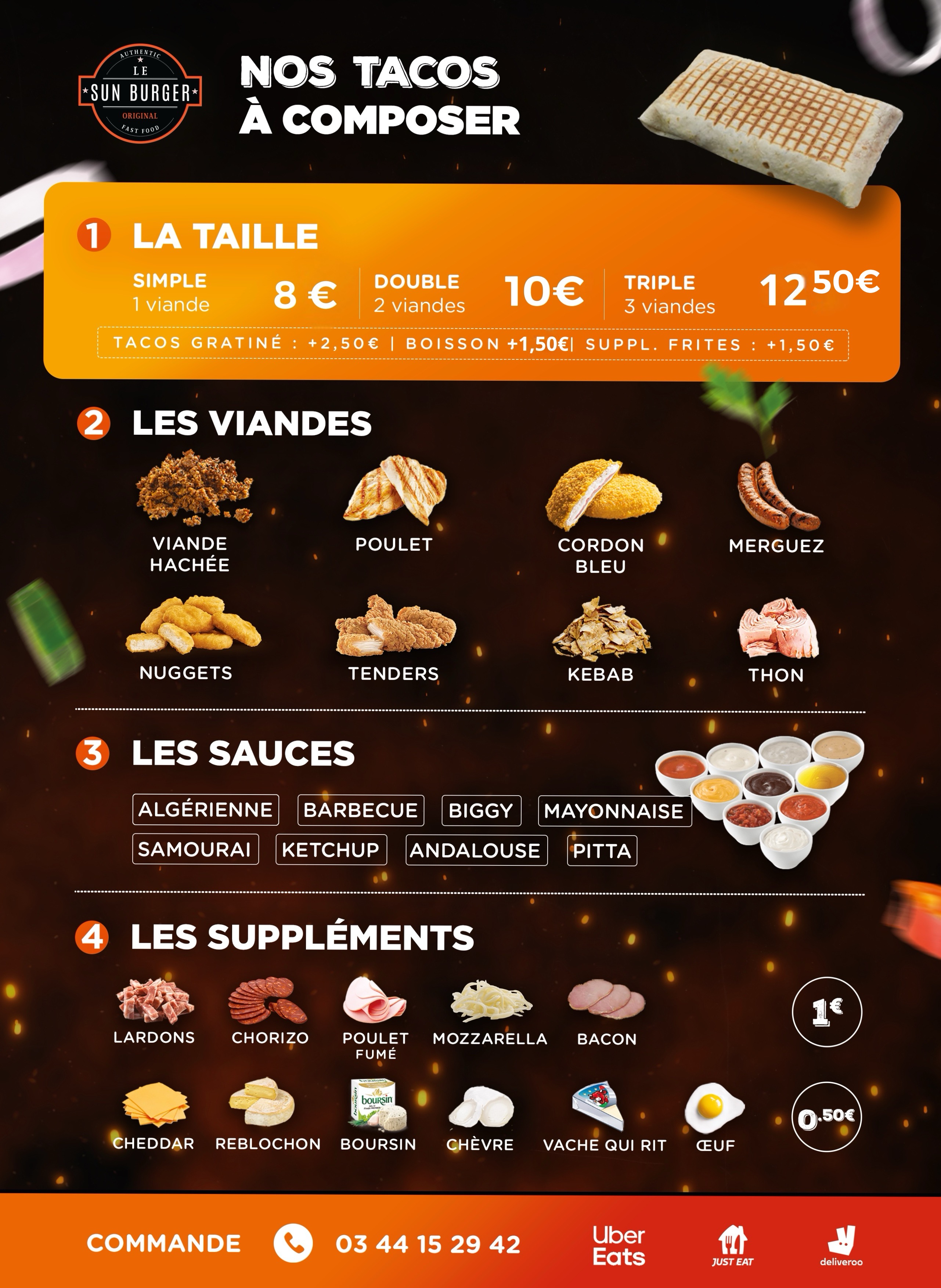 Chez SUN BURGER, nous vous invitons à découvrir nos burgers savoureux, préparés avec des ingrédients frais et de qualité. Que vous soyez amateur de viande ou végétarien, notre carte propose des options pour tous les palais. Les amateurs de sensations fortes apprécieront nos tacos généreusement garnis, une explosion de saveurs dans chaque bouchée.